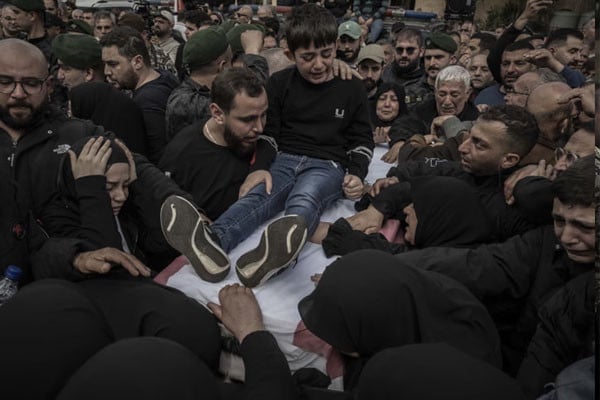لبنان کے جنوبی شہر نباطیہ میں اسرائیل کے فضائی حملوں میں شہید ہونے والے 13 سیکیورٹی اہلکاروں کی اجتماعی نمازِ جنازہ میں ہزاروں شہریوں، سرکاری حکام اور سکیورٹی اہلکاروں نے شرکت کی۔