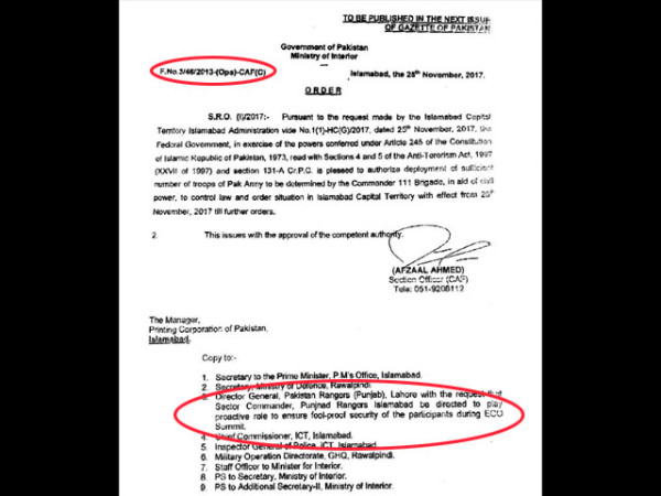 نوٹیفکیشن میں تیسرے نمبر پر ڈی جی رینجرز پنجاب کو مخاطب کیا گیا ہے اور انییں ہدایت کی گئی ہے کہ وہ ای سی او سمٹ میں شرکت کرنے والے شرکا کی سیکیورٹی کو یقینی بنائیں، حالانکہ یہ سمٹ 2013 میں منعقد ہوئی تھی۔