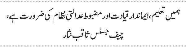 چیف جسٹس ثاقب نثار نے کہا کہ ہمیں تعلیم، ایماندارقیادت اور مضبوط عدالتی نظام کی ضرورت ہے، نئی نسل ہماری طرف دیکھ رہی ہے کہ ہم کیا کرکے جاتے ہیں۔ کئی چیزیں ایسی ہوتی ہیں جو ہم مصلحتوں کی بنیاد پر بھی نہیں کہہ سکتے، اب ملک میں قانون اور آئین کی حکمرانی رہے گی، ہم جمہوریت کوپامال نہیں ہونے دیں گے۔