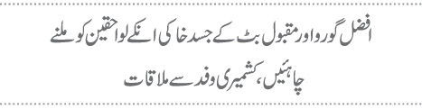 افضل گورواور مقبول بٹ کے جسد خاکی انکے لواحقین کو ملنے چاہئیں،کشمیری وفد سے ملاقات فوٹو: فائل