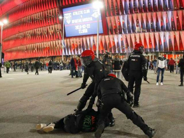 اسپین میں ایتھلیٹک بلباؤ اور اسپارٹک موسکو کے درمیان سنسنی خیز میچ کے دوران مداح آپس میں لڑ پڑے، پولیس کی مداخلت پر مشتعل شائقین کے پتھراؤ سے ایک پولیس اہلکار ہلاک ہو گیا۔