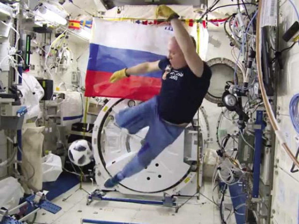 اسپیس ایجنسی روسکاسموس کی جانب سے جاری کردہ فوٹیج میں خلانورد اولیگ آرٹمیویوف اور اینٹن شکاپلورف نے میگا ایونٹ کی ٹی شرٹس پہن کر ککس لگائیں۔ کشش ثقل نہ ہونے کے وجہ سے فٹبال ہوا میں گھومتی اور معلق رہی۔ پریس ریلیز میں بتایا گیاکہ ورلڈکپ کی آفیشل بال خلا میں بھیجی گئی تھی اور اس کی واپسی اتوار کو ہوگی۔