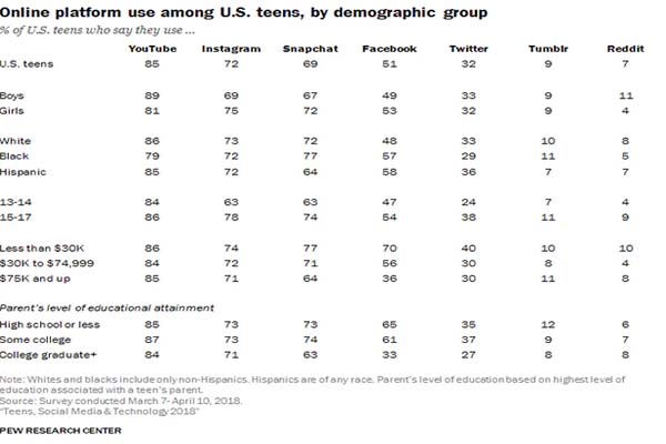 امریکا کے نجی تحقیقاتی ادارے پیو ریسرچ سینٹر (Pew Research Center) کی جانب سے کیے گئے اس سال کے سروے میں حیران کن اعداد و شمار سامنے آئے ہیں۔ 2015ء میں اسی ادارے کی جانب سے کیے گئے سروے کے تقابلی جائزے سے پتا چلا کہ نوجوانوں میں فیس بک کا استعمال 71 فیصد سے گھٹ کر 51 فیصد رہ گیا ہے جب کہ نوجوانوں میں انسٹا گرام کی مقبولیت 52 فیصد سے بڑھ کر 72 فیصد اور اسنیپ چیٹ کی 41 فیصد سے بڑھ کر 69 فیصد ہوگئی ہے۔