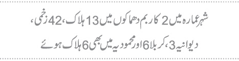شہر عمارہ میں 2 کار بم دھماکوں میں 13 ہلاک،42 زخمی، دیوانیہ 3، کربلا 6 اور محمودیہ میں بھی 6 ہلاک ہوئے