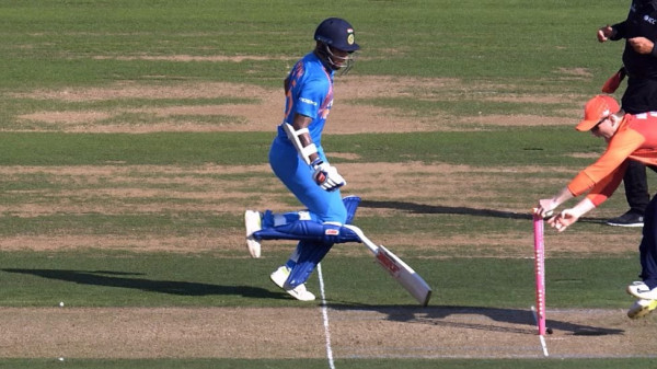 روہت شرما کے صرف 5 رنز پر پویلین جانے کے بعد مہمان سائیڈ کو اپنے دوسرے اوپنر سے بھی ہاتھ دھونا پڑے، انھوں نے پہلے لیام پلنکٹ کی گیندکو پل کرنا چاہااور ناکامی پر سنگل کیلیے دوڑے،گیند پر نظریں ٹکائے ہونے کی وجہ سے رفتار سست تھی،صورتحال اس وقت اور خراب ہوگئی جب کریز عبور کرنے کے دوران بیٹ ہی ہاتھ سے چھوٹ گیا، دھون کو اس انداز میں آؤٹ ہونے پر سوشل میڈیا پر شائقین نے خوب برا بھلا کہا جبکہ بعض نے اسے مشکوک بھی قرار دیا۔