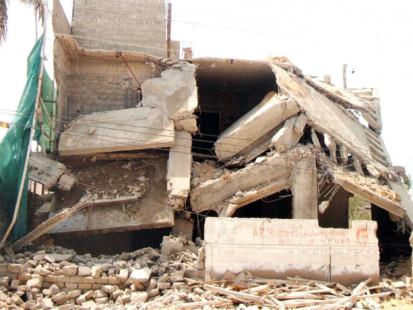 غیر قانونی تعمیرات کے خلاف مہم کے دوران گلشن اقبال بلاک 7 میں منہدم کیا گیا مکان فوٹو : ایکسپریس