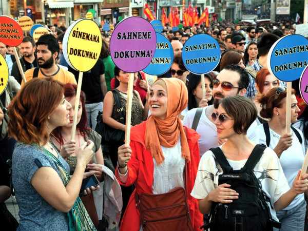 استنبول کے تقسیم اسکوائر میں مظاہرین مختلف پلے کارڈ اٹھائے حکومت کیخلاف احتجاج کررہے ہیں ۔ فوٹو : اے ایف پی