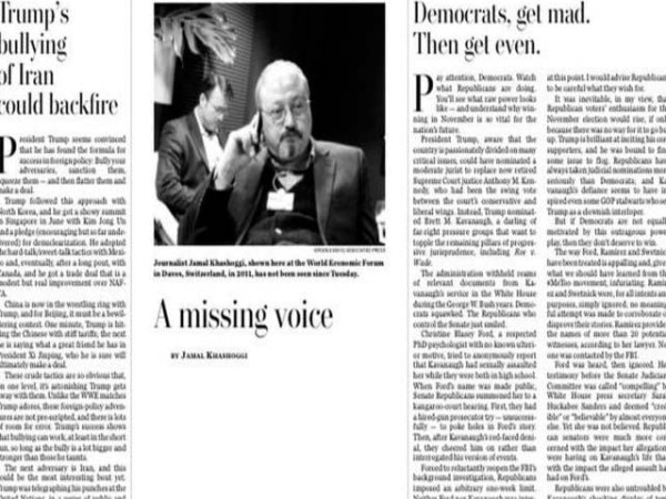 واشنگٹن پوسٹ نے تین دن سے لاپتا اپنے صحافی کے بازیاب نہ ہونے پر خالی کالم ' ایک گمشدہ آواز' لاپتا صحافی جمال خشوگی کے نام اور تصویر کے ساتھ چھاپ دیا ہے تاکہ جبری گمشدگی کا معاملہ دنیا کے سامنے آسکے اور لاپتا صحافی کے حق میں مشترکہ اور توانا آواز اُٹھائی جاسکے۔