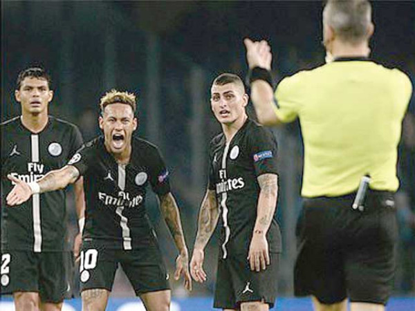 یوئیفا چیمپئنز لیگ میں نپولی کیخلاف 1-1 سے ڈرا ہونے والے میچ میں پیرس سینٹ جرمین کے برازیلین فٹبالر نیمار ریفری بورن کیوپرز سے الجھ پڑے۔ ڈچ ریفری کیوپرز نے میچ کے اختتامی مرحلے میں نیمار کو یلو کارڈ دکھایا تھا۔