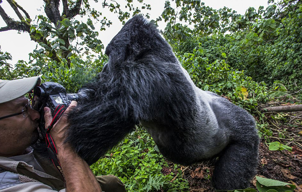 کرسٹوفر ویسلن گوریلا کے بچے کی بہترین تصویر لینے کی کوشش کررہے تھے کہ اس نے غصے میں آکر انہیں پیچھے دھکیل دیا۔