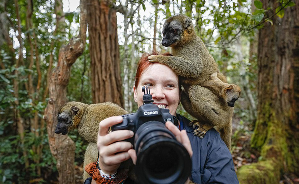 پیارے اور بھولے بھالے لیمور کی تصویر کشی ہر فوٹوگرافر کا خواب ہوتا ہے کیونکہ ان کی تصاویر بہت دلفریب ہوتی ہیں تاہم لیمور خود اس خاتون فوٹوگرافر کے گرویدہ ہوگئے اور اپنائیت کا احساس کررہے ہیں۔