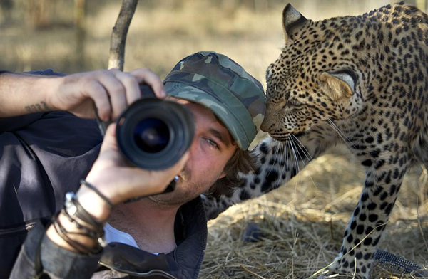 رسل مِک لافلِن جنوبی افریقہ کے شوکودو پارک میں تصویر بنارہے تھے کہ ایک تیندوا ان کا حال پوچھنے ان کے قریب پہنچ گیا۔