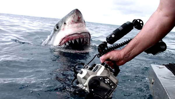 ڈیو رِگز نے سفید شارک کے سامنے اپنا کیمرہ رکھا تو عقب سے کسی دوست نے یہ منظر قید کرلیا۔