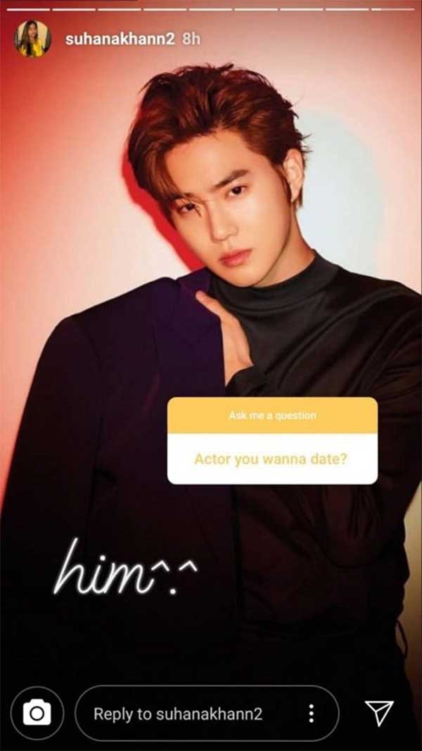 سہانا خان نے حال ہی میں انسٹاگرام پر لائیو چیٹ کے دوران اپنے چاہنے والوں سے براہ راست بات کی اور ان کے سوالوں کے جواب دئیے۔ دوران گفتگو ایک مداح نے سہانا سے سوال پوچھا ''آپ کون سے اداکار کے ساتھ باہر جانا پسند کریں گی؟'' جس کے جواب میں سہانا خان نے کوریا کے معروف اداکار اور گلوکار سوہو کی تصویر شیئر کی اور کہا وہ سوہو کو بہت پسند کرتی ہیں اور اسی کے ساتھ باہر جائیں گی۔