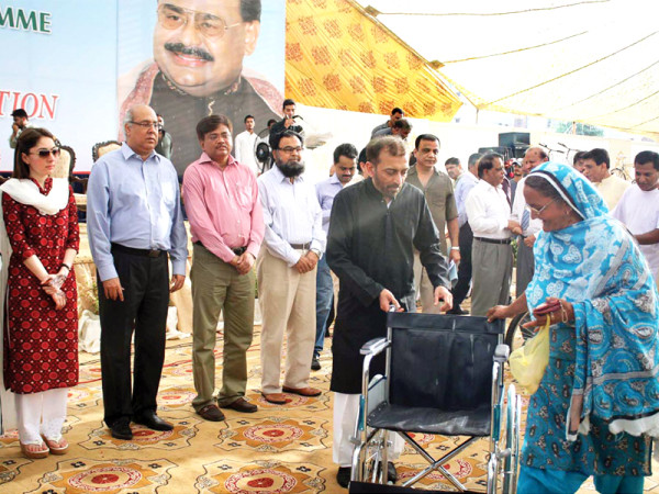 کراچی: خدمت خلق فائونڈیشن کے تحت سالانہ پروگرام میں فاروق ستار خاتون کو وہیل چیئر دے رہے ہیں، اس موقع پر شرمیلا فاروقی اور دیگر موجود ہیں۔ فوٹو: آن لائن