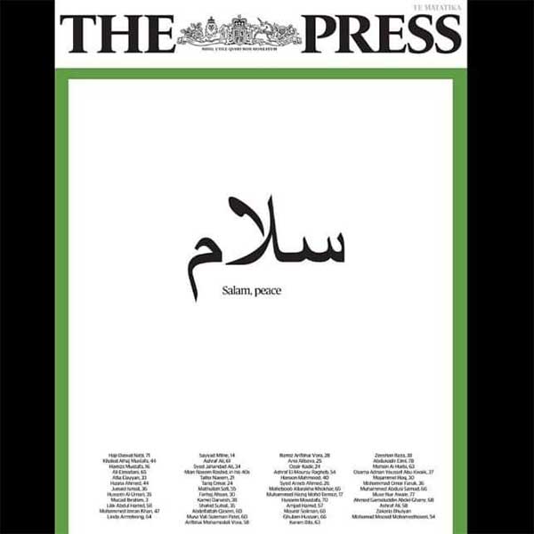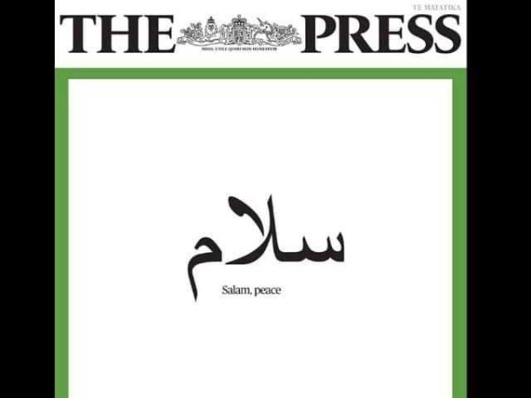 نیوزی لینڈ کے اخبار''دی پریس ''نے اپنے صفحہ اول پر خبر شائع کرنے کے بجائے مسلمانوں سے اظہار یکجہتی کرتے ہوئے بڑے اور واضح الفاظ میں ''سلام'' شائع کیا۔ یہ دنیا کی تاریخ میں پہلی بار ہے کہ کسی اخبار نے اس طرح مسلمانوں سے یکجہتی کا اظہار کیا ہو۔
