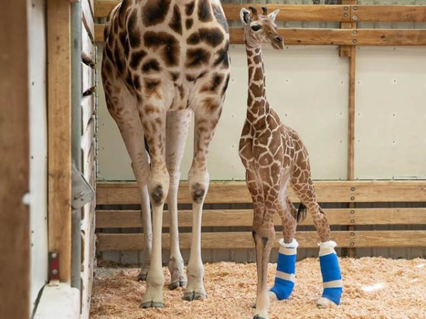 چند روز قبل مادہ اولیویا سے پیدا ہونے والا بچہ زرافہ ویسے تو نارمل پیدا ہوا تھا لیکن اس کےبعد عملے نے محسوس کیا کہ اس کی پچھلی ٹانگوں کا نچلا حصہ ہموار اور سیدھا نہیں ہے اور اگر یہی سلسلہ جاری رہا تو بڑا ہونے کے بعد اسے چلنے میں دقت پیش آسکتی ہے۔