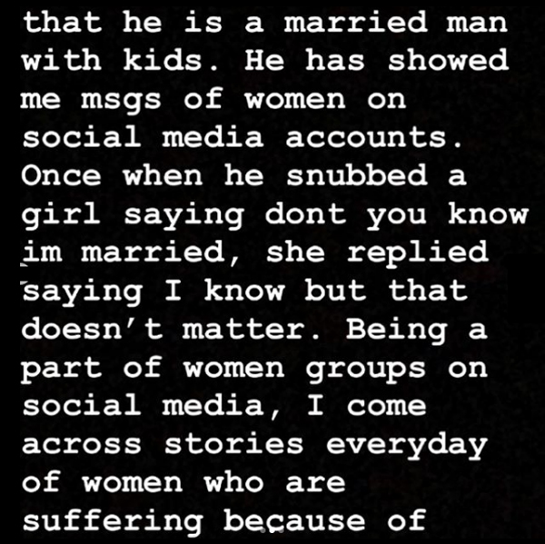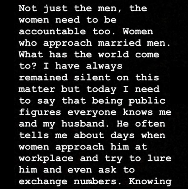 اداکارہ نے یہ بھی کہا کہ شوہر نے مجھے سوشل میڈیا پر خواتین کے میسجز بھی دکھائے۔ ایک روز انہوں نے غصے میں خاتون سے کہہ بھی دیا کہ کیا آپ کو پتا نہیں ہے کہ میں شادی شدہ ہوں جس پر خاتون نے جواب دیا کہ مجھے پتا ہے لیکن یہ باتیں معنی نہیں رکھتیں۔