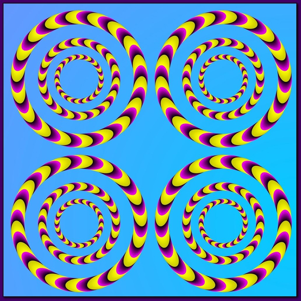 ذیل میں دی گئی تمام تصویریں ساکن ہیں لیکن اگر آپ صرف چند سیکنڈ کےلیے انہیں نظر جما کر دیکھیں گے تو یوں لگے گا جیسے ان میں حرکت ہورہی ہے، حالانکہ ایسا کچھ بھی نہیں۔ اور تو اور، اگر آپ ان میں سے کسی بھی تصویر کو صرف ایک منٹ کےلیے ٹکٹکی باندھ کر دیکھیں گے تو یوں لگے گا جیسے آپ کا سر چکرانے لگا ہے۔