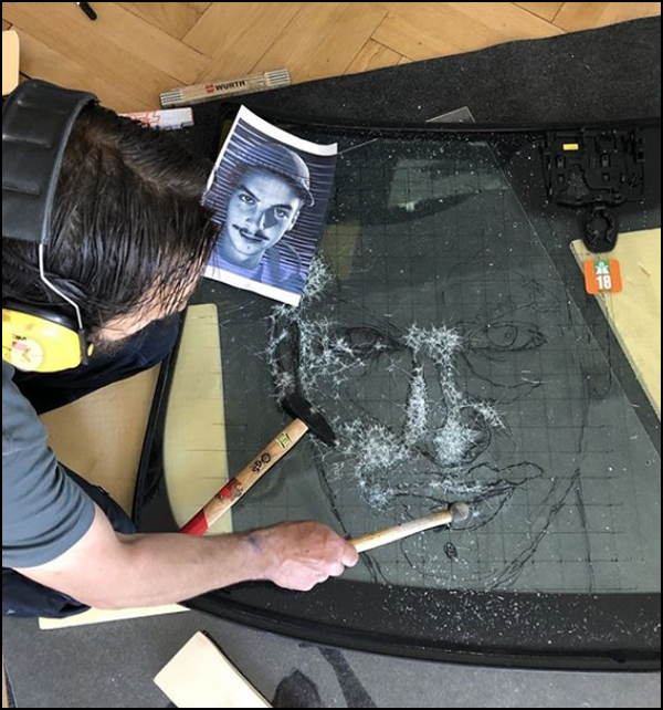 اس مقصد کےلیے وہ لیمی نیٹڈ شیشہ استعمال کرتے ہیں کیونکہ وہ ہتھوڑے اور چھینی کی پہلی ضرب سے ٹوٹتا نہیں بلکہ اس میں صرف بال پڑتے ہیں۔ جب ان تصویروں کو قریب سے دیکھا جاتا ہے تو یوں لگتا ہے جیسے شیشے میں بے تحاشا بال آگئے ہوں اور وہ ٹوٹنے والا ہے۔ لیکن کچھ فاصلے سے دیکھنے پر پتا چلتا ہے کہ وہ تو دراصل ایک تصویر ہے۔