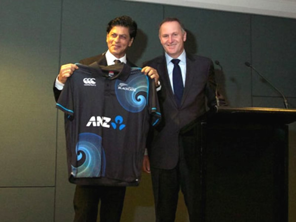 آکلینڈ: شاہ رخ خان نیوزی لینڈ کے وزیراعظم جان کی ، کی طرف سے دی گئی کرکٹ ٹیم کی ٹی شرٹ میڈیا کو دکھا رہے ہیں،فوٹو: فائل
