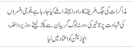 مذاکرات کا ایجنڈا، طریقہ کار اور مقام طے کیا جارہا ہے، میجر جنرل ثنااللہ کی شہادت اور چرچ پر حملے کے واقعات طالبان سے مذاکرات میں تاخیر کا سبب بنے۔ گزشتہ روز اسپیکر قومی اسمبلی سردار ایاز صادق کے چیمبر میں پارلیمانی رہنمائوں کے اجلاس میں قائد حزب اختلاف خورشید شاہ ، فاروق ستار، چوہدری شجاعت، شاہ محمود قریشی، عبدالغفور حیدری، آفتاب شیرپائو، شیخ رشید اور دیگر کو طالبان سے مذاکرات کے بارے میں بریفنگ دیتے ہوئے انھوں نے اس بات کو خوش آئند قرار دیا کہ طالبان سے مذاکرات کے عمل میں حکومت کو تمام جماعتوں کا اعتماد حاصل ہے۔