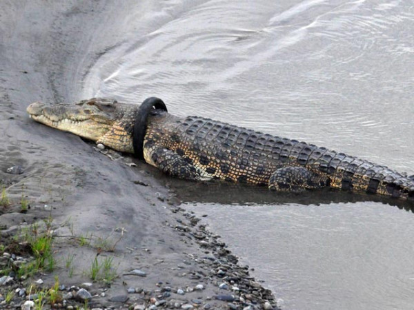 کئی ماہ سے موٹر سائیکل کا ٹائر مگر مچھ کی گردن میں پھنسا ہوا ہے، فوٹو : اے ایف پی
