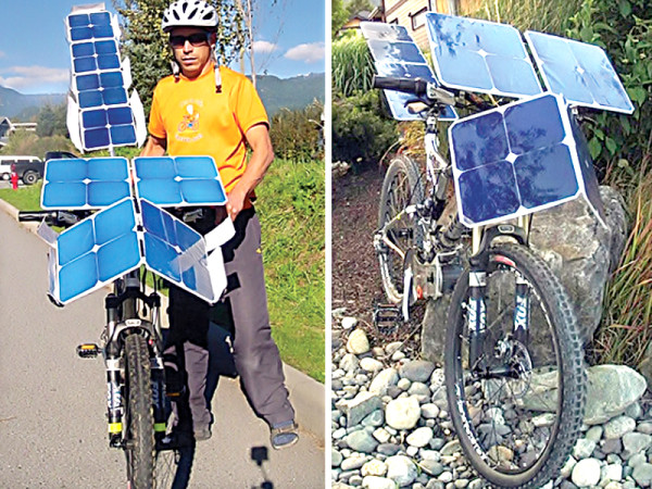 دلچسپ انداز کی سائیکل میں پیڈلز کے ہمراہ پچھلی سیٹ اور ہینڈل کے ساتھ 8سولر پینل لگائے ہیں فوٹو: فائل