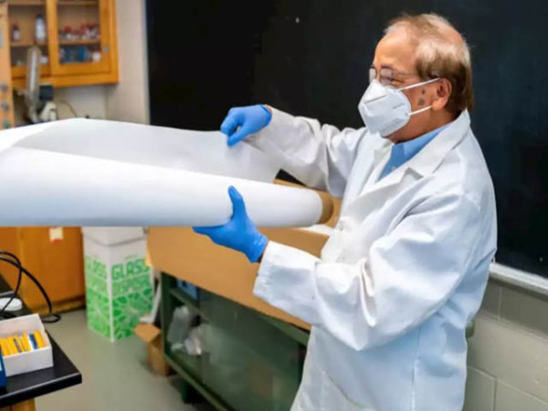 یونیورسٹی آف کینٹکی کے ڈاکٹر دیبکار بھٹا چاریہ ایںٹی وائرل کورونا ماسک پر لگانے والی پرت کا رول دکھارہے ہیں۔ فوٹو: یونیورسٹی آف کینٹکی