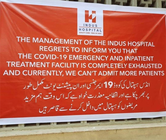 جمعہ کی رات انڈس اسپتال انتظامیہ نے اسپتال کے باہر بورڈ آویزاں کردیا کہ کورونا وائرس کے مریضوں کے لیے قائم وارڈز مکمل طور پر بھر چکے ہیں لہذا اب کورونا کے مریضوں کو اسپتال میں داخل نہیں کیا جائے گا۔ اس نوٹس سے معاملے کی سنگینی کا اندازہ لگا جاسکتا ہے۔