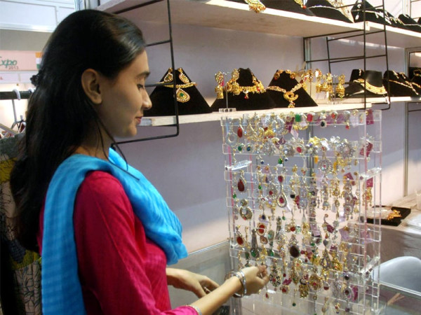 کراچی: ایکسپوسینٹرمیں دوسری انڈیا ایکسپومیں لگے ایک اسٹال پر خاتون جیولری پسند کر رہی ہیں ۔ فوٹو : راشد اجمیری / ایکسپریس