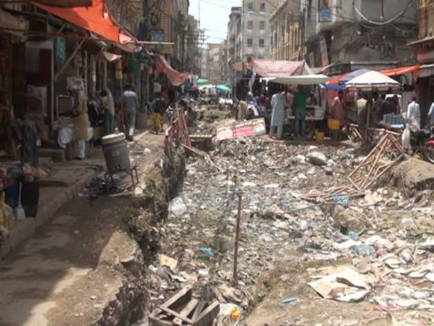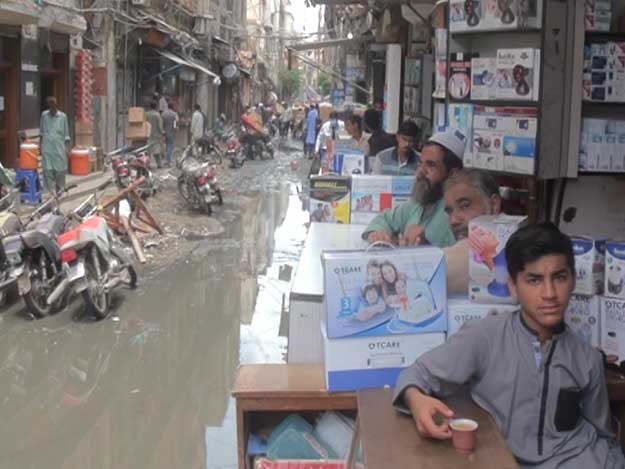 میڈیسن مارکیٹ کی گلیوں سے بارش اور سیوریج کے پانی کی تاحال نکاسی نہیں ہوسکی فوٹوایکسپریس
