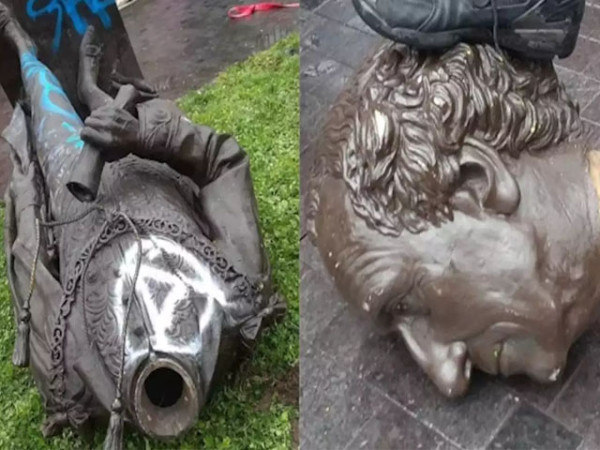 مظاہرین نے مجسمے سے سر کو جدا کردیا، فوٹو : اے ایف پی