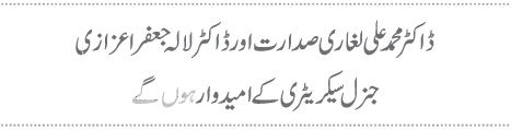 ڈاکٹر محمد علی لغاری صدارت اور ڈاکٹر لالہ جعفر اعزازی جنرل سیکریٹری کے امیدوار ہوں گے