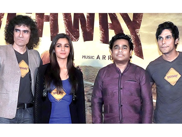 ممبئی: بھارتی اداکار رندیپ ہوڈا، اداکارہ عالیہ بھٹ، گلوکار اے آر رحمان اور ہدایتکار امتیاز علی فلم ’’ہائی وے‘‘ کا ٹریلر ریلیز کرنے کی تقریب میں شریک ہیں۔ فوٹو: اے ایف پی