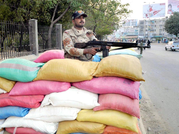 چہلم امام حسین کے جلوس کی گزر گاہ کے راستے پررینجرز اہلکار عارضی چوکی میں چوکس کھڑا ہے ۔ فوٹو : ایکسپریس