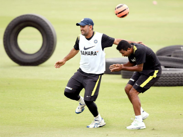 ڈربن: بھارتی کپتان دھونی پریکٹس سیشن میں ساتھی پلیئر اوجھا کے ساتھ فٹبال کھیل رہے ہیں۔ فوٹو: اے ایف پی