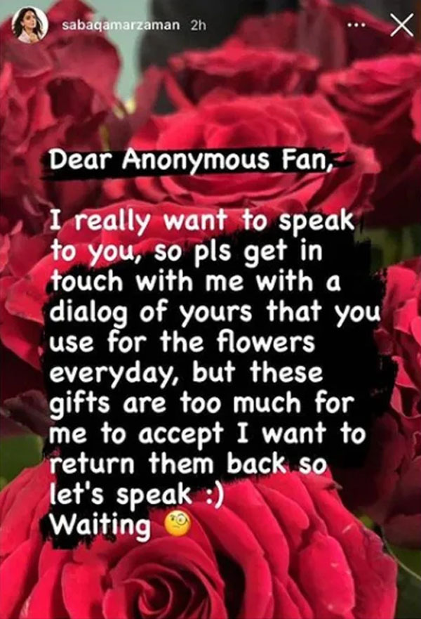فلم اسٹار صباء قمر نے روزانہ گلدستہ بھیجنے والے اپنے گم نام مداح کے نام خصوصی پیغام دیا ہے۔