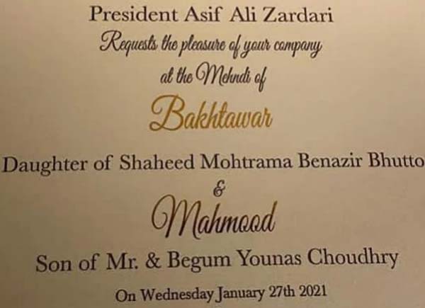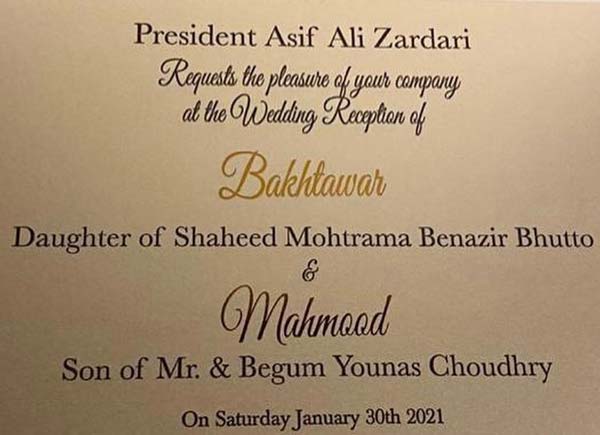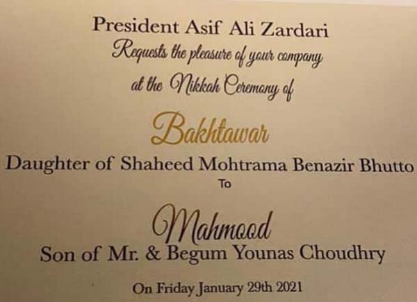 ایکسپریس نیوز کے مطابق بے نظیر بھٹو اور آصف زرداری کی بیٹی بختاور بھٹو زرداری کی شادی لاہور کے تاجر محمود چوہدری سے رواں ماہ ہورہی ہے، اس حوالے سے 24جنوری کو بلاول ہاؤس کراچی میں میلاد کا انعقاد کیا گیا ہے جب کہ بختاور بھٹو زرداری کی مہندی کی تقریب 27 جنوری، نکاح 29 جنوری جب کہ استقبالیہ 30 جنوری کو کراچی میں ہوگا۔