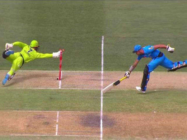 سڈنی تھنڈر کے کرس گرین کی گیند پر اسٹرائیکر فل سالٹ نے اسٹریٹ شاٹ کھیلا جس پر گیند بولر گرین کے ہاتھ کو چھوتے ہوئے اسٹمپس پر لگی، اس وقت نان اسٹرائیکر ویدرلڈ کریز سے باہر ہونے کے سبب رن آؤٹ ہوگئے تھے۔