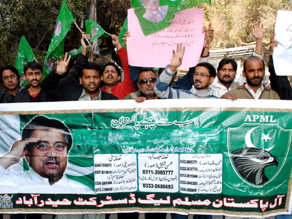 سابق صدر ریٹائرڈ جنرل پرویز مشرف کی حمایت میں آل پاکستان مسلم لیگ کے تحت حیدرآباد پریس کلب کے سامنے احتجاجی مظاہرہ کیا گیا۔
