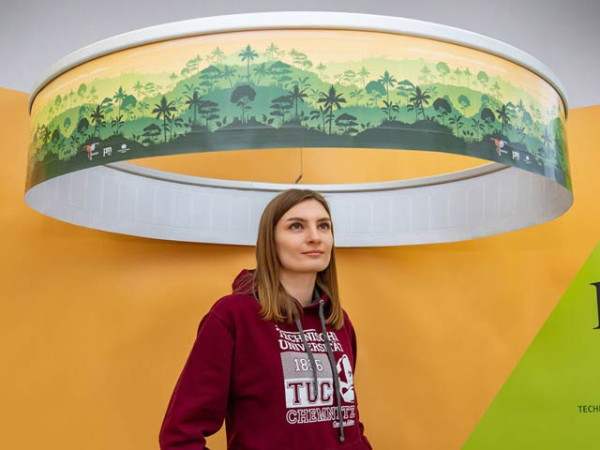 تصویر میں خاتون کے سر کے اوپر کاغذی اسپیکر نمایاں ہیں جس میں لگے 56 اسپیکر 360 درجے میں آوازیں خارج کرتے ہیں۔ فوٹو: شیمنزیونیورسٹی آف ٹیکنالوجی