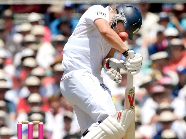 سڈنی ٹیسٹ: مچل جونسن کے بائونسر پر گیند انگلش بیٹسمین گیری بیلنس کے ہیلمٹ سے ٹکرانے کا منظر۔ فوٹو: پی اے فوٹوز