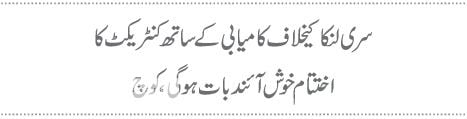 سری لنکا میری جائے پیدائش بھی ہے، چند کھلاڑی بڑے اچھے دوست لیکن میدان میں صرف حریف ہیں، کنٹریکٹ کا اختتام ان کے خلاف سیریز کی فتح سے ہو تو بڑی خوشی کی بات ہوگی،اس مقصد کے حصول کیلیے بولرز کو لازمی طور پر میچ میں 20 وکٹیں حاصل کرنے کی تیاری کرنا ہوگی۔انھوں نے کہا کہ ابوظبی میں پاکستانی ٹیم مصباح الحق اور یونس خان کی سنچریوں کا بعد ازاں فائدہ نہیں اٹھا سکی، پہلی اننگز میں برتری زیادہ ہونی چاہیے تھی۔ انھوں نے 49اوورز میں وکٹ سے محروم رہنے والے سعید اجمل کا دفاع کرتے ہوئے کہا کہ مختلف وجوہات کی بنا پر اسپنر کو پچ سے مدد حاصل کرنے میں دشواری کا سامنا رہا،حریف ٹیم نے صورتحال کے مطابق بہترین بیٹنگ سے کامیاب دفاع کرتے ہوئے پاکستان کی فتح کیلیے مہم کمزور بنادی۔