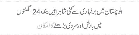 وقفے وقفے سے برفباری کا سلسلہ جاری رہا جس سے کوئٹہ زیارت سنجاوی شاہراہ بلاک ہوگئی ، پشین سے نمائندہ کے مطابق پشین شہرسمیت سرانان یارو بوستان سرخاب خانوزئی حرمزئی اوردیگر علاقوں میں وقفے وقفے سے برفباری جاری رہی،رشور اورتوبہ کاکڑی میں گزشتہ24گھنٹوں کے دوران ایک فٹ برف پڑی،قلات اورگردونواح میں ہونے والی برفباری نے چاروں اطراف سے سفید چاراوڑھ لی،سوراب اورمستونگ میں بھی برفباری اوربارش نے معمولات زندگی مفلوج کرکے رکھ دیے،قلعہ عبداﷲ میں بھی برفباری کے باعث پہاڑوں، درختوں اورمیدانی علاقوں نے سفید چادر اوڑھ لی۔ادھرسکھر، پنوعاقل، دادو، گھوٹکی اورپڈعیدن میں بدھ کو دن بھر ہونے والی ہلکی بارش اوربوندا باندی کے بعد سردی کی شدت میں اضافہ ہوگیا،دادو کے پہاڑی پر مقام گورکھ ہل پر بارش کے بعدبرف باری بھی ہوئی،موسم سرما کی پہلی بارش کے بعدبڑھنے والی سردی کے باعث لوگ اپنے گھروں تک محدود ہوگئے۔