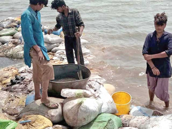 ابراہیم حیدری کے ساحل پر بیٹریوں کے تیزابی مواد کو سمندری پانی سے دھویا جارہا ہے