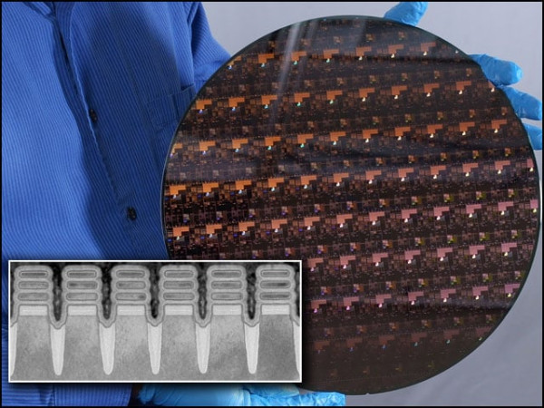 دو نینومیٹر جسامت کے ٹرانسسٹرز (چھوٹی تصویر) والا سلیکان ویفر جس پر درجنوں پروسیسرز ایک ساتھ موجود ہیں۔ (تصاویر: آئی بی ایم)