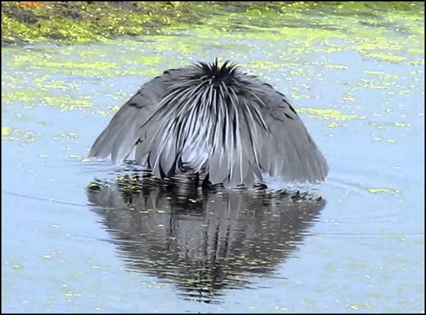 پھر یہ اپنے پروں کو دائرے کی شکل میں پانی کے بالکل اوپر پھیلا دیتا ہے، اس طرح کہ ایک چھتری بن جاتی ہے اور پانی پر اس کا سایہ پڑنے لگتا ہے۔