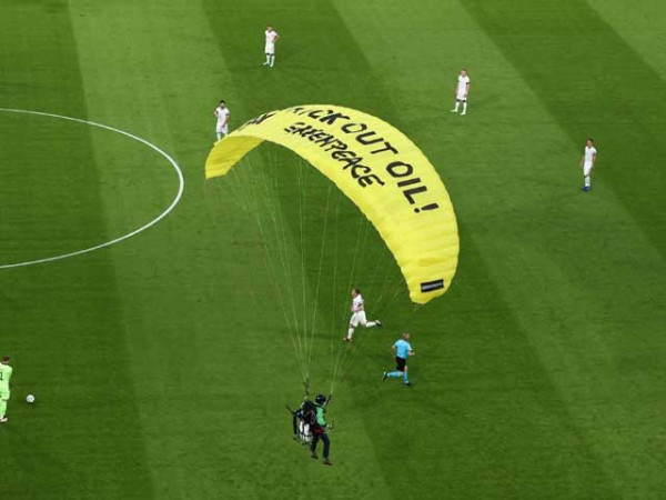 گرین پیس پیراشوٹر یورو 2020 میچ کے موقع پر اسٹیڈیم میں کود گیا۔