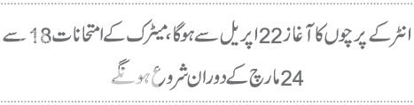 انٹر کے پرچوں کا آغاز 22 اپریل سے ہوگا، میٹرک کے امتحانات 18سے 24مارچ کے دوران شروع ہونگے